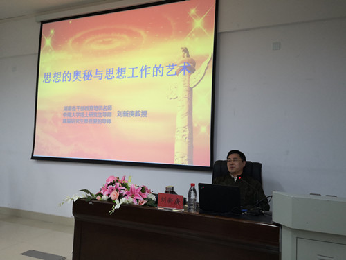 刘教授的报告主要从思政科学价值导论、思想的奥秘与解读、思想工作的艺术探讨和习近平高校思想政治工作的新思路等四个方面展开。他指出当前思想工作的关键是思想政治工作者不想做、不敢做、不愿做、不知怎样做思想工作的问题,并介绍了习近平高校思想政治工作的新思路,主要有把立德树人作为中心环节,把思想政治工作贯穿教育教学全过程。他认为教学工作从根本上来说也是思想工作,勉励在场的老师要认真领会思想工作的艺术,更好担起学生健康成长指导者和引路人的责任。