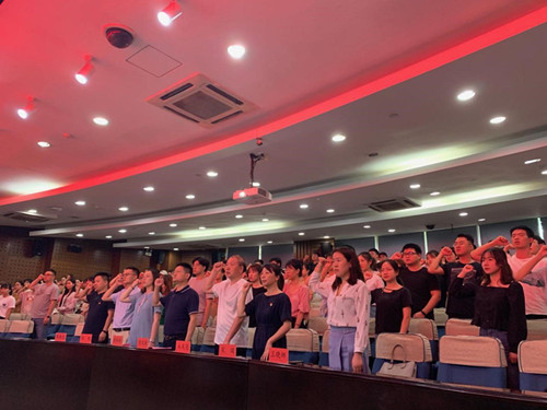 随后,大会进行了党徽授予和入党宣誓仪式。商学院2019年上半年新发展党员按照队列整齐地上台,与会领导和党支部书记亲手为新党员佩戴党徽。“我志愿加入中国共产党,拥护党的纲领,遵守党的章程,履行党员义务,执行党的决定……”本科生会计第四党支部饶心雨带领新党员面向党旗庄严宣誓,在鲜红的党旗下,全体党员佩戴党徽,举起右手、握紧拳头,表达对党的忠诚和为共产主义事业奋斗终身的决心。与会老党员与新党员一同重温了入党誓词。