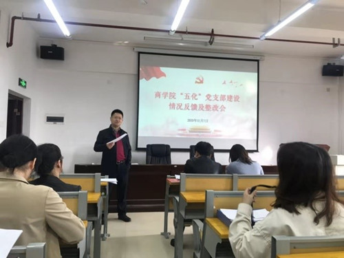 为深入贯彻党的十九大精神与习近平新时代中国特色社会主义思想,全面推进从严治党向基层延伸,加强基层党支部建设,我院于2019年11月7日在博文楼南1205召开了党支部“五化”建设情况反馈及整改会。商学院党委书记陈文俊、党务秘书王晓娜、各党支部书记参加了本次会议,校党委组织部李广军副部长、刘柳科长应邀出席了会议。