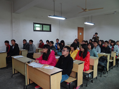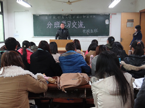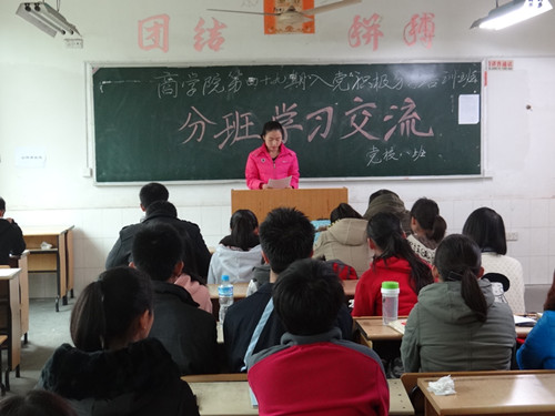 2012年11月24日早上九时,第49期商学院分党校入党积极分子培训班八个班(231人)在原经干一教学楼一、二楼教室分别举行班级学习交流会。2010级会计第一、二党支部、2010级农资党支部和2010级营国党支部分别派出唐婉露、杨盈、罗茜、彭智魁、李莎、袁野、喻家俊、肖玭等八名中共正式党员,分别担任这八个班的主持人,主持班级的学习交流活动。商学院副处级组织员吴友亮和具体负责第49期培训工作的学生党员干部陈芳芳、李志杰到各班进行指导。