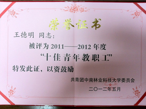 2012年5月15日下午,中南林业科技大学“纪念建团九十周年暨2011—2012学年度共青团工作表彰大会”在音乐厅隆重举行。学校党委书记曾思齐、副书记秦立春、副校长李建奇、曹福祥、纪委书记张迪华出席大会,学校有关职能部门负责人、各院系党委(党总支)副书记、团委书记及学生代表400多人参加了大会。大会总结了过去一年来学校共青团工作取得的显著成效和丰硕成果,表彰了一批在工作中涌现出来的先集体和先进个人。商学院正科级辅导员王德明老师荣获中南林业科技大学首届“十佳青年教职工”荣誉称号,受到大会表彰。