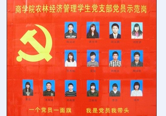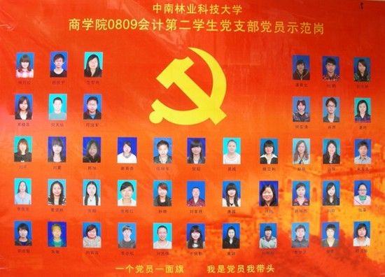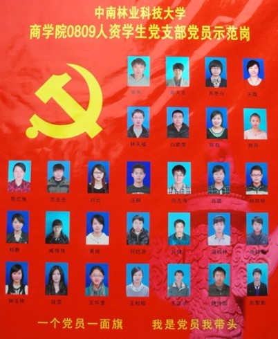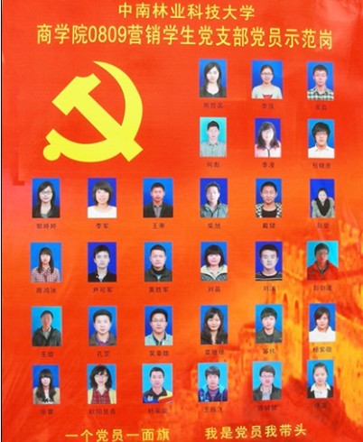中南林业科技大学商学院共有党员419人(其中教工党员56人,学生党员363人),在创先争优活动中,根据学校关于转发《关于做好2011年度公开承诺工作的通知》(湘创先办发﹝2011﹞1号)文件的通知要求,各学生党支部(农经党支部,0809级会计1支部,0809级会计2支部,0809人资党支部,0809级营销党支部)分别在学校体育看台侧对面、一、二学生食堂、青园校区女生宿舍等多处学生生活区设立了党员示范岗,党员亮出身份、亮出承诺、亮出形象;党员带头学习提高、带头争创佳绩、带头服务同学、带头遵纪守法、带头弘扬正气。