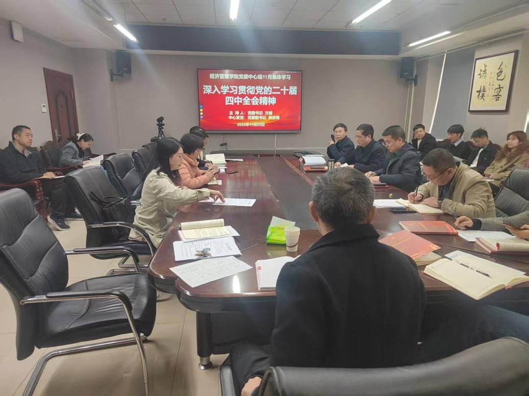 11月25日下午,学院党委理论学习中心组在博文楼南1206会议室开展“深入学习贯彻党的二十届四中全会精神”集体学习。党委书记方威主持会议,方威和常务副院长朱玉林分别领学,党委副书记熊启明作中心发言,全体党政班子成员、党支部书记参加会议。