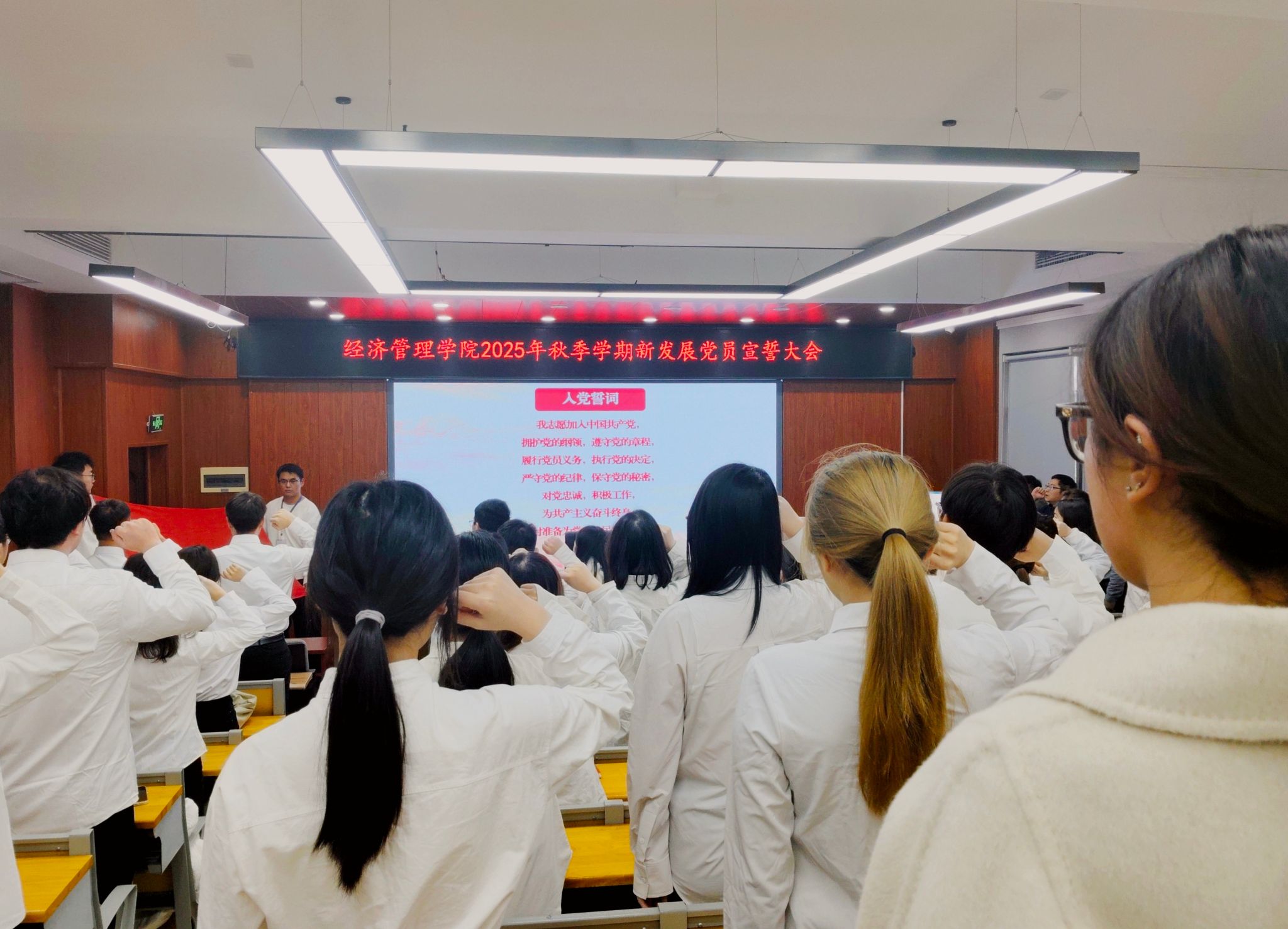 大会在激昂的《国际歌》中拉开了序幕。3名新党员代表上台,接受党组织授予的党徽与党章。100名新党员面向党旗,庄严宣誓。
