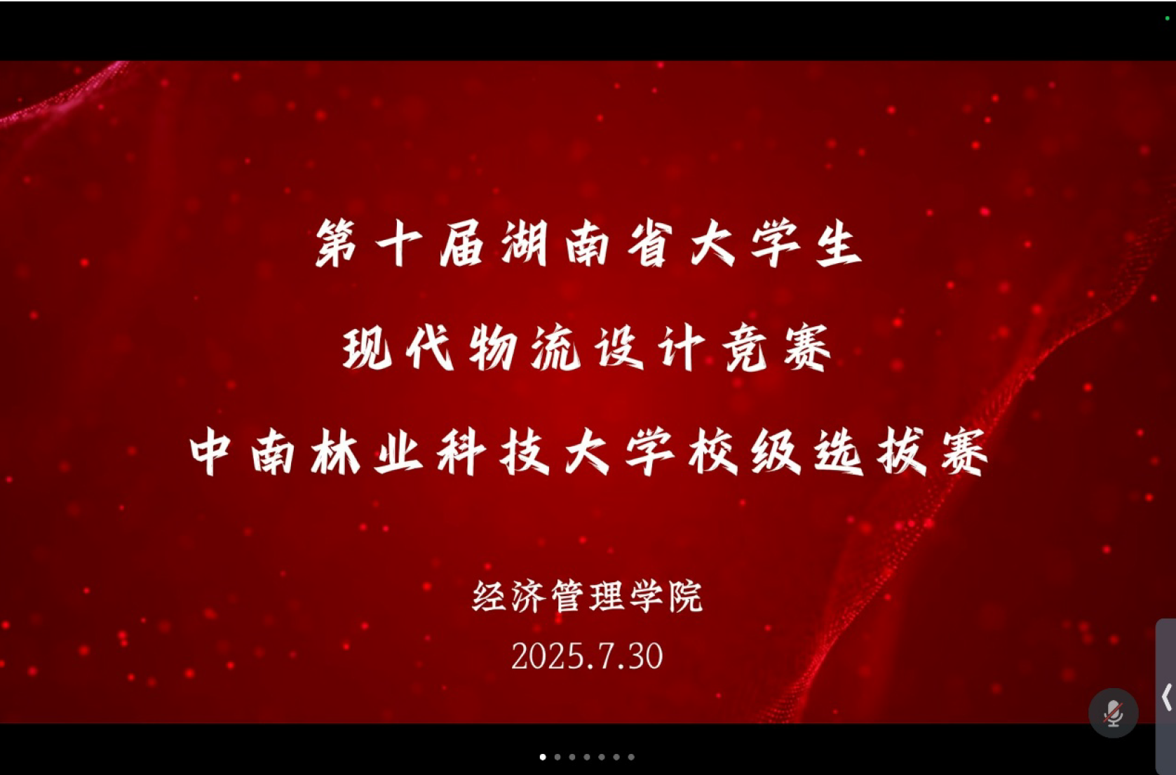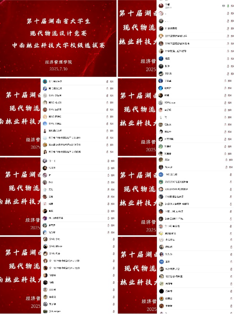 2025年7月30日,由经济管理学院承办的第十届湖南省大学生现代物流设计竞赛中南林业科技大学校级选拔赛顺利展开。此次选拔赛以线上腾讯会议的方式开展,物流工程系谢美全老师、王娟老师,物流管理系郭婷老师、罗端高老师,供应链管理系刘瑞环老师、万瑶老师出席并担任评委。本次选拔赛共有18 支队伍参赛,设置了一等奖、二等奖、三等奖、优胜奖共4 个奖项,并选拔出3 支优秀团队报名参加省赛。