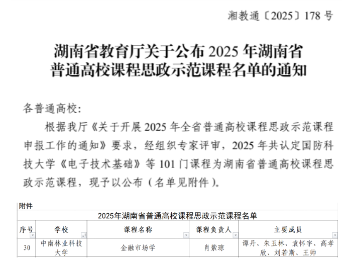 近日,湖南省教育厅公布了2025年湖南省普通高校课程思政示范课程名单。我院肖紫琼老师主持的《金融市场学》课程成功入选,这一成果不仅是对课程教学团队深耕课程思政建设的高度认可,更充分彰显了我院在课程思政领域的扎实基础与建设实力。