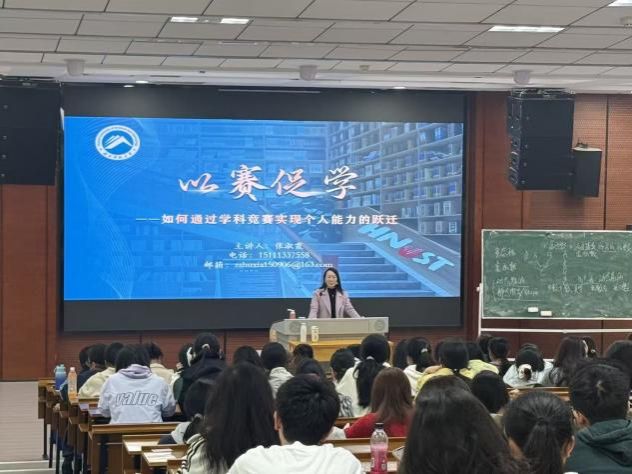 讲座伊始,张淑霞副教授抛出 “同学们对学科竞赛的第一印象是什么” 这一问题,引发热烈讨论,巧妙引导大家审视对竞赛的固有认知;随后,她深入阐释学科竞赛价值,强调其不仅是检验专业学习成果、展现能力的 “练兵场”,更是推动自我认知深化、实现个性化成长的 “加速器”,能助力学生清晰洞察自身优劣势,针对性提升综合素养;最后,围绕 “锚定竞赛价值,激活成长动能” 的核心,从“知行合一”、“知识贯通”、“能力跃迁”三大维度展开了深度分享。