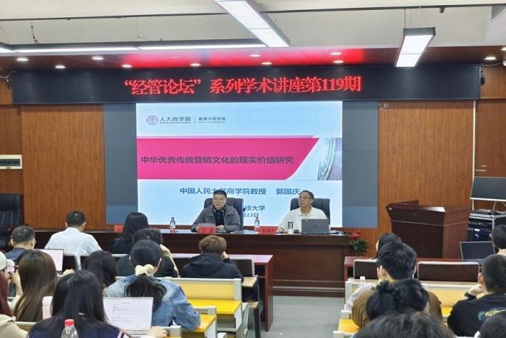 2025423日上午,我院举办的“经管论坛”系列学术讲座第119期暨教育部市场营销课程教学虚拟教研室名家讲坛“中华优秀传统营销文化的现实价值研究”在博文楼南1205成功举办。本期讲座嘉宾是中国人民大学二级教授、博士生导师、享受国务院政府特殊津贴专家、首届国家级课程思政教学名师郭国庆教授,讲座由经济管理学院党委书记方威教授主持,100多名师生参加学习。