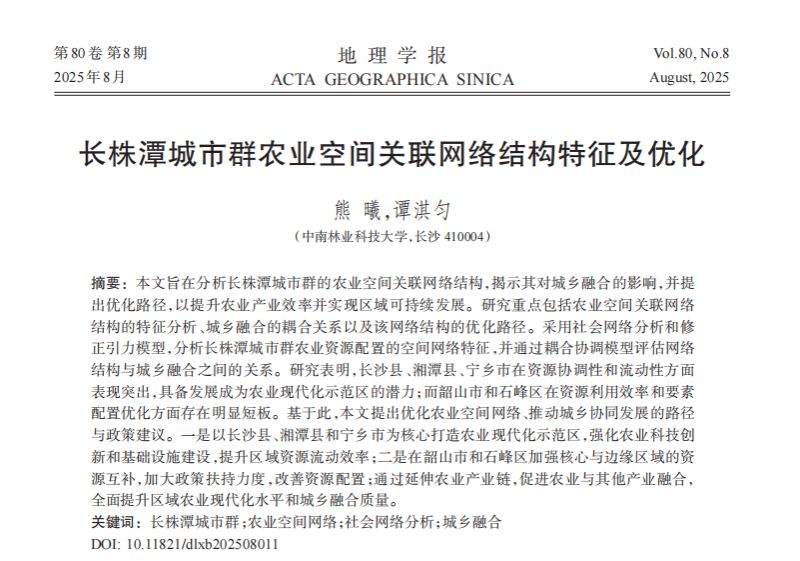 近日,我院熊曦教授与研究生谭淇匀在我国地理学领域权威期刊《地理学报》发表题为《长株潭城市群农业空间关联网络结构特征及优化》的文章。