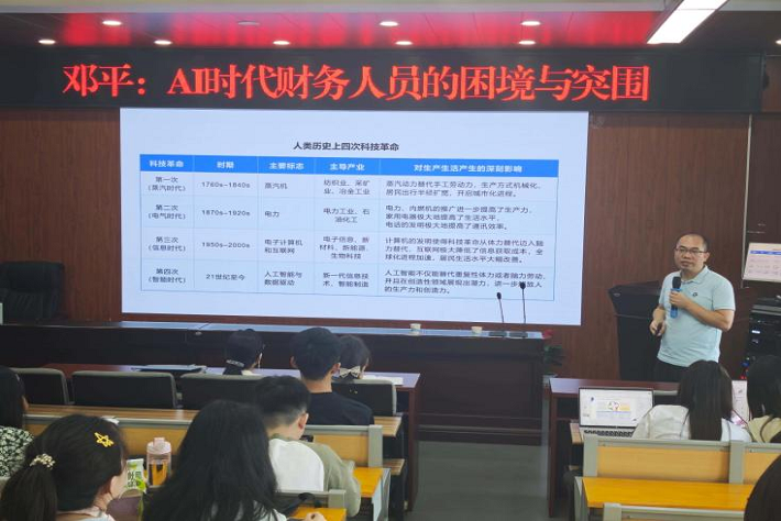 讲座伊始,邓平博士以人工智能技术革命为切入点,结合湖南钢铁集团在AI与业务融合中的实践案例,阐释了技术革新对财务决策效能提升的显著作用。针对财务人员面临的转型压力,他围绕三大核心维度展开深度剖析:工作方式变革,自动化技术加速取代传统流程,人机协同模式亟待重构;职能定位转型,从核算记录转向战略支持,需突破固有职能边界;人才需求升级,复合型能力成刚需。