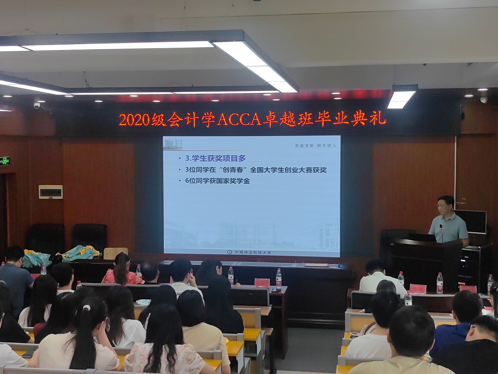 敬文举从人才培养目标、办学特色、成绩荣誉等方面总结了ACCA卓越班办学成果;与会领导先后为ACCA全科通过同学们颁发“ACCA榜样之星”荣誉证书;优秀毕业生代表杨思懿和张艾分别发表学习感言;班主任邓丽君和彭喜阳祝福同学们毕业快乐,前程似锦;学院就业专干马龙老师解读了就业政策及毕业生档案有关事项。李婷在总结发言中向全体毕业生提出三点嘱托和希望:一要“筑牢”红色底色,做新时代的开拓者;二要擦亮“绿色”名片,做高质量发展的贡献者;三要实现“金色”梦想,做精彩人生的奋斗者。