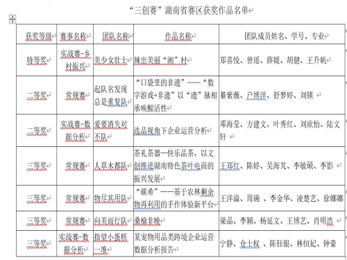 经过激烈的角逐,由姜微、李龙老师指导,郑喜悦、曾瑶、薛媛、胡健、王升帆同学创作的辣出美丽“湘”村荣获“三创赛”湖南省赛区实战乡村振兴赛事特等奖,实现历史性的突破。我校学生获得“三创赛”特等奖1项,二等奖2项、三等奖4项;获得湖南省大学生电子商务大赛二等奖3项,三等奖2项。