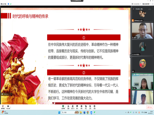 本科生第一党支部曾瑶同志以《攻坚克难的力量——从革命精神到科创竞赛》为主题讲授微党课,她结合大学期间参加科创竞赛的经历,分享大学生应如何学习运用老一辈革命家的崇高风范和优良传统,将焕发出来的学习、工作热情转化为攻坚克难的强大动力。