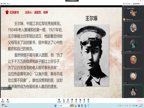 按照有关要求,要“组织党员读红色家书、讲红色故事、看红色教育片,或到本地红色教育基地现场体验”。会上,本科生第一党支部凌楚艺和伍辉同志共读王尔琢家书《以身许国,革命不成功立誓不回家》,本科生第一党支部俞芷琦同志讲述红色故事《点亮了长征希望之光的“七根火柴”》。支部要求党员自行就近就便到革命遗址旧址、革命博物馆、纪念场馆、党性教育基地、红色革命基地参观,各位党员参观了人民英雄纪念碑、中国共产党历史展览馆、上海中共一大会址、延安革命纪念馆、平江起义纪念馆、湘南起义纪念馆、湘西剿匪纪念园以及故居、各地党史馆等纪念场馆,让参观党员的思想得到洗礼与升华,重温了初心和使命,鼓舞了努力拼搏的精气神。