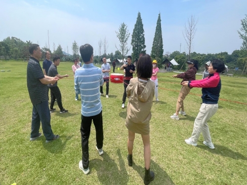 上午,在金洲村拓展营地开展了团建拓展活动。活动以系成员为主体,分为6个小分队。第一项活动为“珠行万里”,整个团队每个队员手拿一根半圆形的球槽,将球连续传动(滚动)到下一个队员的球槽中,并迅速地排到队伍的前端,继续传送前方队员传来的球,直到球安全的到达指定的目的地为止。第二项活动为“跳动的心”,一个四周系上若干条红绳的大鼓,团队所有人每人抓住红绳的另一末端,一起使放在大鼓上的球连续跳动起来。经过角逐,会计队、国商队、行政队获总分一等奖,农经队、营销队、人资队获总分二等奖,会计队、行政队获“行云流水“怦然心动”特别奖。