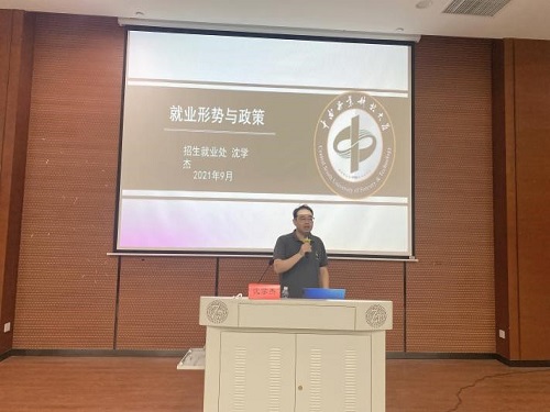 其接下来由招生就业处沈学杰科长讲述就业形势与政策。围绕着我校的就业管理机制、就业形势、我校现阶段毕业生就业政策、以及“我”该如何去做四个方面为2022届毕业生做了详尽的指导。沈老师的的讲述让同学们详细地了解到了毕业后的就业形势,指明了前进的方向。