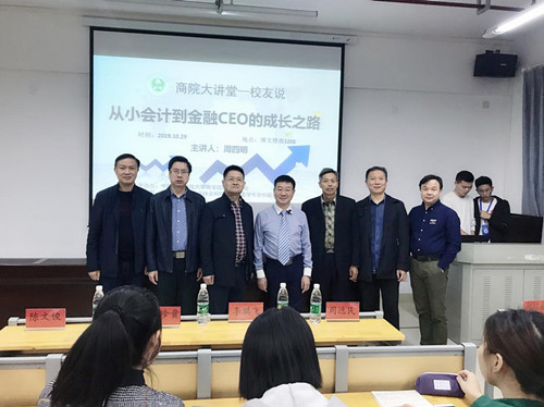 20191029日晚7:00-9:00,商院大讲堂MPAcc专场在博文楼南1205学术报告厅举行。本次论坛主要面向我校MPAcc研究生和部分本科生。本次论坛的主讲嘉宾为我校优秀校友、现任职穗甬融信资产管理股份有限公司副总裁的周四明先生。主题报告分为两部分:第一部分为“从会计员到金融CEO的成长之路”,第二部分为“基于绿色健康金融环境建设的不良金融资产重组路径分析”。