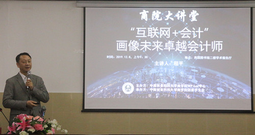 2019128日上午930,商院大讲堂MPAcc专场在西园图书馆二楼学术报告厅举行。中国云会计概念的提出者、春秋战国翻转课堂原创设计者、会计教育专家委员会理事、重庆理工大学会计学院副院长、重庆理工大学云会计大数据智能研究所所长、中国“互联网+会计”教育综合改革的先行者、博士生导师程平教授应邀讲学。本次论坛主题为“互联网+会计”画像未来卓越会计师,主要面向我校会计系全体教师、MPAcc研究生和部分本科生。论坛由学院党委书记陈文俊教授主持。