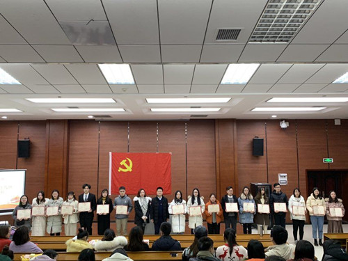 在场党员奏唱国歌之后,陈书记发表讲话,他总结了学院2018年党建工作,并希望我院党员在接下来的学习生活中能用党员标准严格要求自己,不断实现自我净化、自我完善、自我提高,永葆共产党员的先进性。学生党员代表孙高达同学进行了发言,他呼吁各位新发展的党员能对照党员的标准找出自己的差距,以高度的自觉性,正确的认识自己,严于剖析自己。在新党员宣誓老党员重温入党誓词之后,由陈书记和徐书记为2018年新发展党员授予党徽。接着,徐书记发表讲话,她寄语青年党员要让自己成为一名有理想信念的人,要让自己成为一名有大爱大德大情怀的人,要让自己成为善为、敢为、有为的人,她希望所有的学生党员能够胸怀理想、追求卓越,保持“咬定青山不放松”的韧劲,鼓足“撸起袖子加油干”的劲头,爱国励志求真力行。会议最后是商学院党员寝室授牌仪式和2018级新生代班聘书颁发仪式,党员大会在雄壮的国际歌中结束。