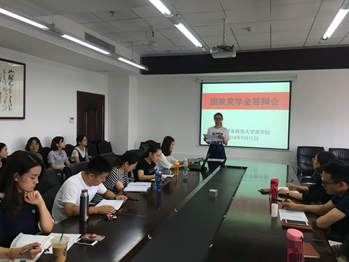 为树立优秀学习榜样,激励同学认真学习,综合发展。2018年9月12日中午12:00在博文楼南1206会议室举行商学院本科生2017-2018年度国家奖学金答辩会,党委副书记徐钰婷及各年级辅导员出席本次答辩会并担任评委。
