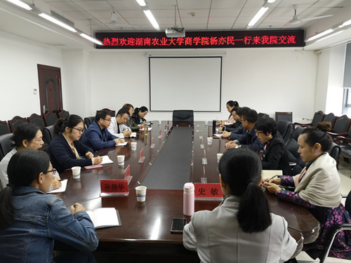 2018年10月18日上午,湖南农业大学商学院副院长杨亦民教授一行到我院学习交流本科评估与MPAcc建设情况。我院院长尹少华,副院长蔡珍贵、邓丽君、甘瑁琴及MPAcc中心主任张昌文等参加了座谈交流。