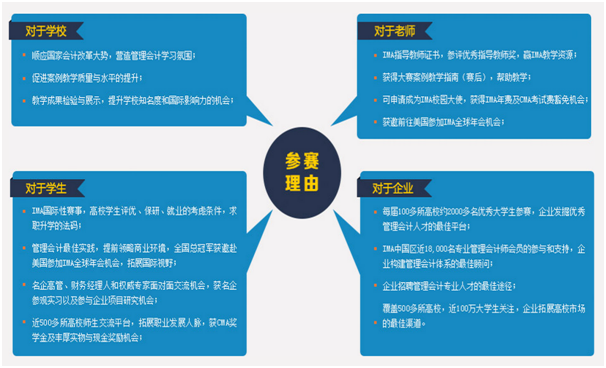 IMA校园管理会计案例大赛为大学生搭建了一个学习管理会计、应用管理会计的校际沟通与学习交流平台。案例竞赛过程,除专业知识外,同学们的创新能力、综合分析能力、沟通技巧和团队协作精神都将得到相应锻炼和提升。同时,参赛团队的表现,也是学生大学学习成果的检验和展示,为就业提供的良好机会和榜样。