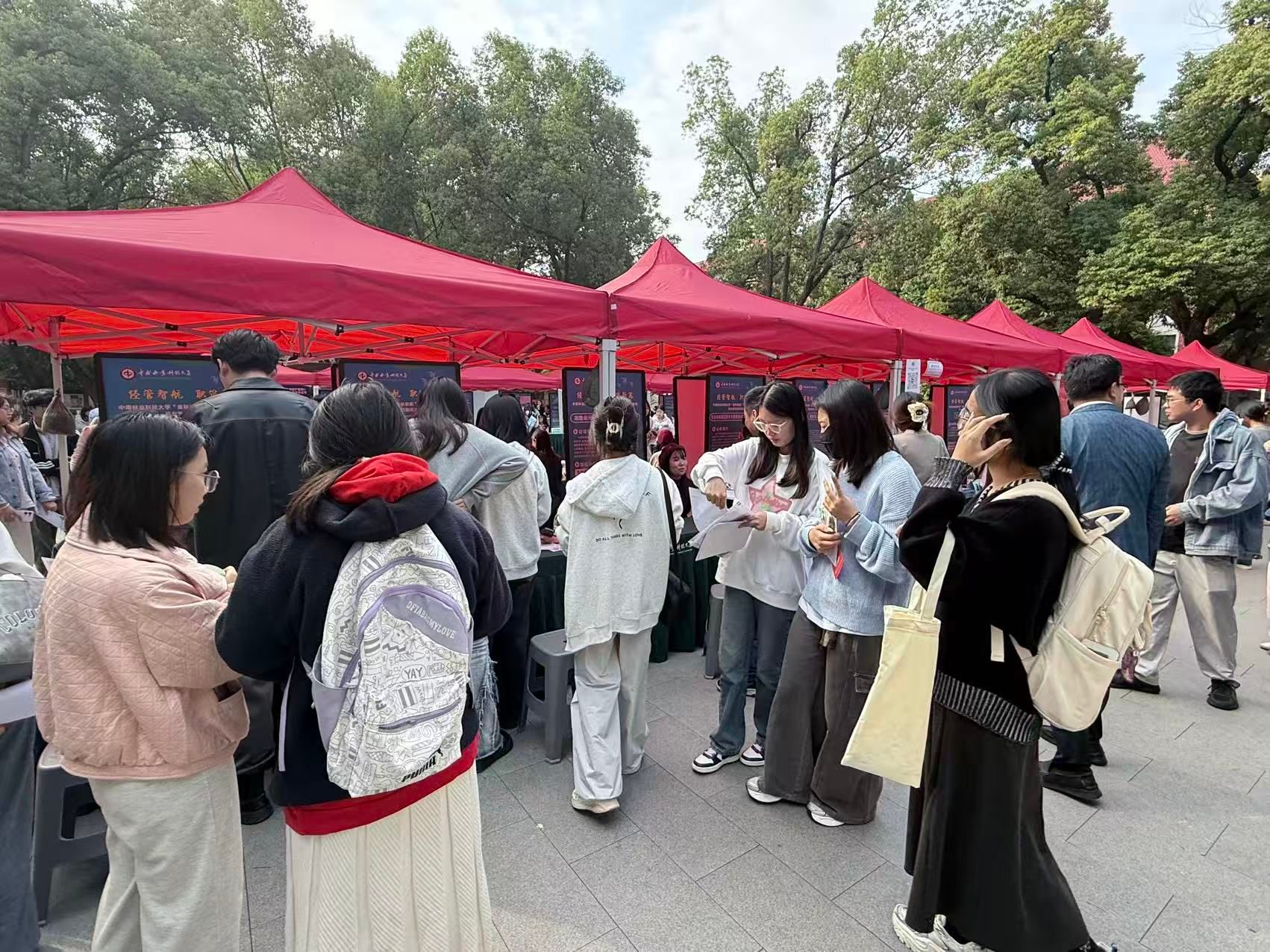 2025年10月28日下午“经管智航 职筑新篇”中南林业科技大学“金秋启航”经管类、外国语类毕业生校园双选会在我校林创广场举办。学院党委书记方威、副书记熊启明与用人单位代表、毕业生现场交流,详细了解企业招聘需求和毕业生求职意向,并鼓励毕业生确定合理的求职目标,把握与优质企业的双向选择机会,找到理想的工作岗位。