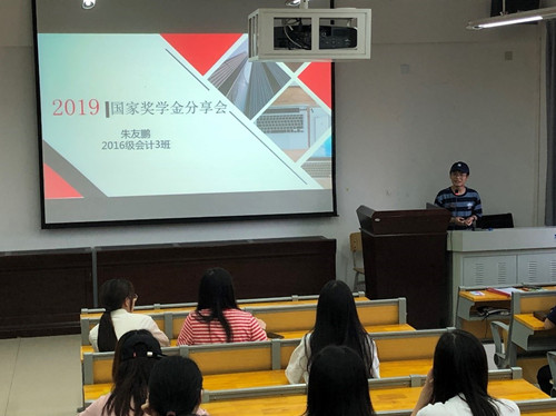 举办国家奖学金经验交流分享会活动。6月13日晚上6:30,我院国家奖学金交流分享会在文综楼1205举行。辅导员翟真杰老师参加了会议,会议出席的还有三位国家奖学金获得者——2016级会计学3班朱友鹏、2016级市场营销2班焦荟燕和2017级ACCA2班陆佳密同学,同时邀请了部分18级家庭经济困难学生、学困生及16、17级专业第一同学参与了本次会议,此次会议由翟真杰老师主持。同学们积极交流发言,会议取得了圆满的成功。