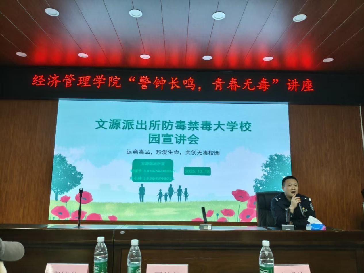 12月18日,学院特邀文源街道派出所所长刘谋千及多位警官共同开展“警钟长鸣,青春无毒”专题讲座。警官们通过真实案例深度剖析毒品危害,有效提升了学生的法律意识与自我保护能力。现场同学肖颖琦表示:“这是我听过最具吸引力的一场讲座,警官们的讲解特别生动。很少见到禁毒讲座能引发这么热烈的回应,我想这次活动的效果确实很不一样。通过讲座我认清了新型毒品的伪装,以后会更加警惕,也会提醒身边人远离毒品。”