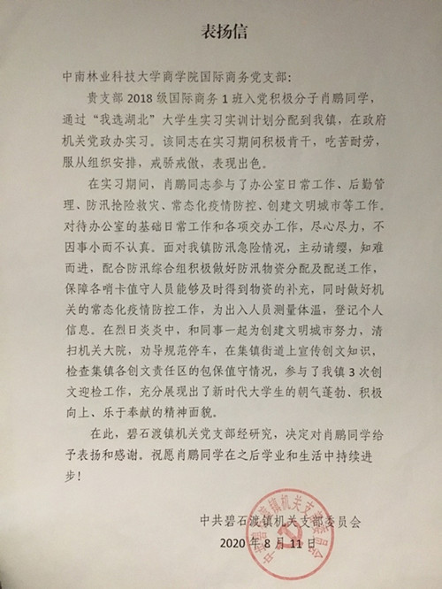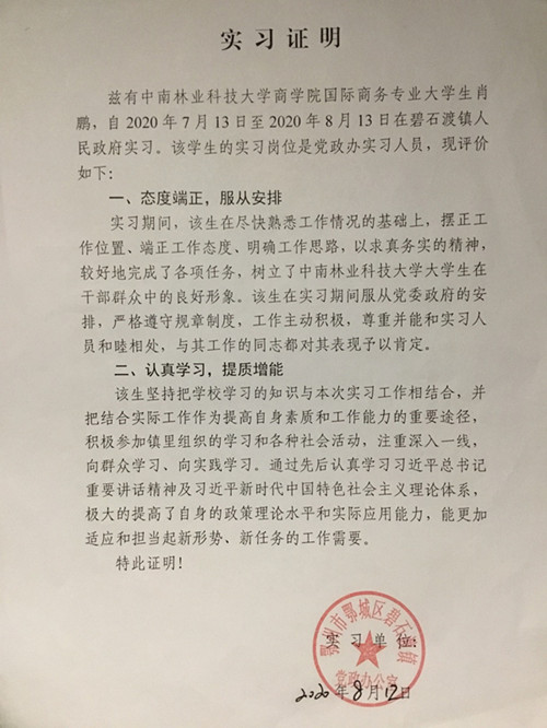 肖鹏同学于2020年7月13日至2020年8月13日在碧石渡镇人民政府实习,获得了一致好评。在困难面前,他用行动诠释了当代青年的精神风貌,用付出彰显了中国青年的责任与担当。作为新时代大学生,奋斗正当时,希望我院学子积极向肖鹏同学学习,做到更加敢为,更加有为。