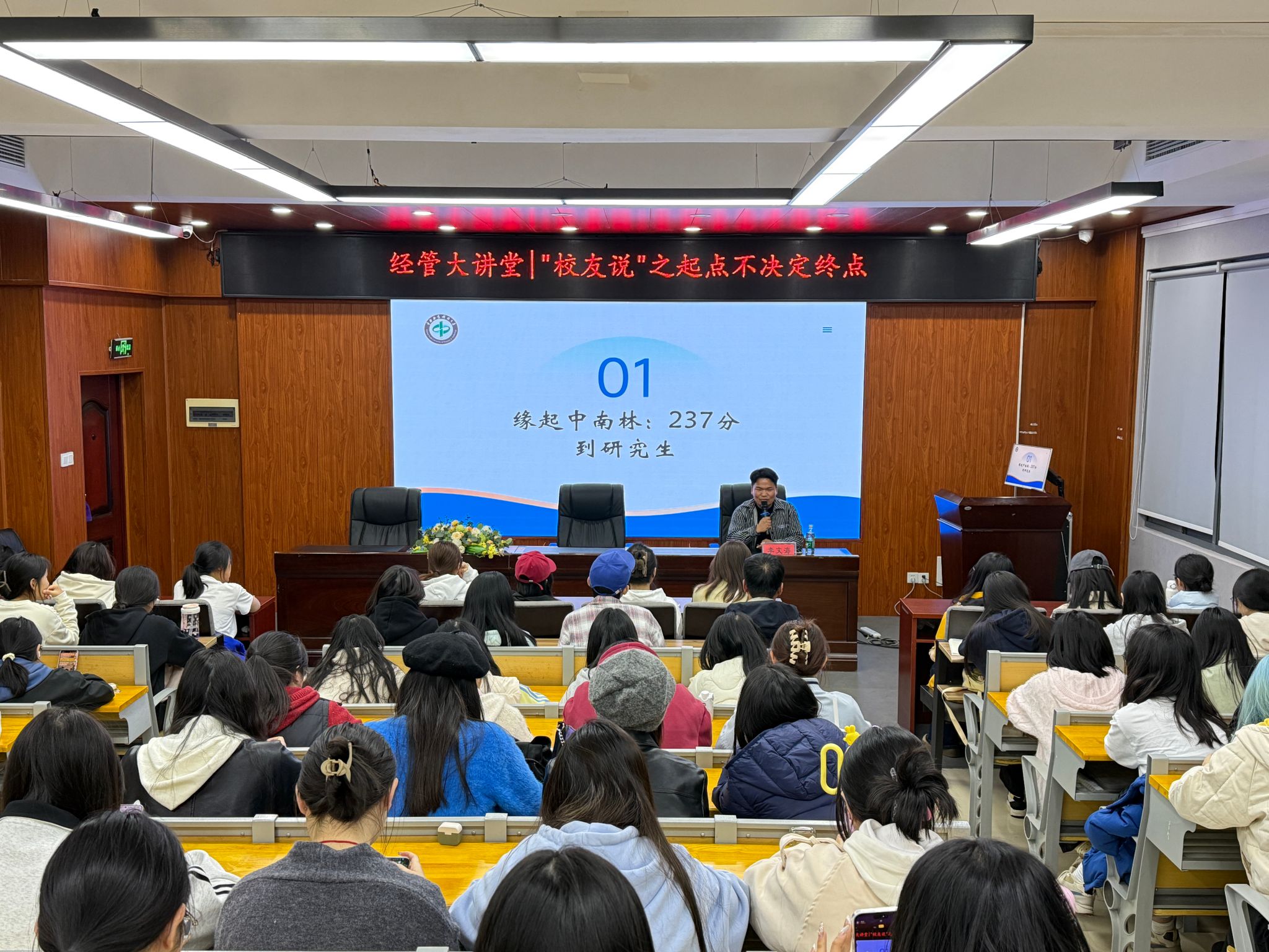 活动中,李文海围绕自身成长轨迹展开分享。他从“缘起中南林”“青春筑基”“躬身实业”“沉潜考研”等七个阶段,讲述了从成人大专到自考本科、再到全日制硕士的“七年三级跳”经历,同时结合当前博士阶段的科研实践,拆解了考研备考的专注方法、学术深耕的落地思路,以及个人优势与行业需求结合的职业规划策略,为在场学子提供了可借鉴的成长范本。